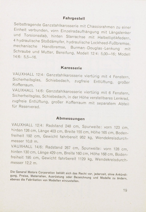 ... Selbsttragende Ganzstahlkarosserie mit Chassisrahmen zu einer Einheit verbunden, vorn Einzelradaufhängung mit Längslenker und Torsionsstab' hinten Starrachse mit Halbelliptikfedern, ydraulische Stoßdämpfer, hydraulische Lockheed-Fußbremse mechanische Handbremse, Burman- Douglas -Lenkung mit Schraube und Mutter, Bereifung, Modell 12/4: 5,00—16' Modell 14/6: 5,5—16. Karosserie VAUXHALL 12/4: Ganzstahlkarosserie viertürig mit 4 Fenstern, Sicherheitsglas, Schiebedach, zugfreie Entlüftung, großer Kofferraum. VAUXHALL 14/6: Ganzstahlkarosserie viertürig mit 6 Fenstern, Sicherheitsglas, Schiebedach, in der Höhe verstellbares Lenkrad,' zugfreie Entlüftung, großer Kofferraum mit separatem Abtei! für Reserverad. Abmessungen VAUXHALL 12/4: Radstand 248 cm, Spurweite: vorn 123 cm hinten 126 cm, Länge 403 cm, Breite 155 cm, Höhe 165 cm, Boden! freiheit 192 cm, Gewicht fahrbereit 952 kg, Wendekreisdurch messer 10,8 m. VAUXHALL 14/6: Radstand 267 cm, Spurweite: vorn 128 cm, hinten 130 cm, Länge 429 cm, Breite 160 cm, Höhe 168 cm, Boden! freiheit 195 cm, Gewicht fahrbereit 1129 kg, Wendekreisdurch messer 12,2 m. Die General Motors Corporation behält sich das Recht vor, jederzeit, ohne Ankündi nhon^n^f SF ^ . f 0 1'0" ' A<«r0stung oder Bezeichnung und Modelle zu ändern ebenso die Fabrikation von Modellen einzustellen. 19 ...