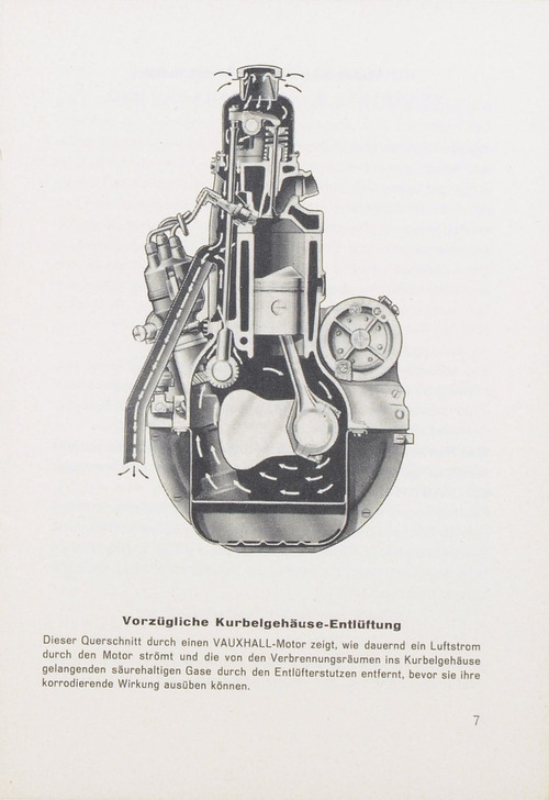 ... o rz ü g lic h e K u rb e lg e h ä u s e -E n tlü ftu n g Dieser Querschnitt durch einen VAUXHALL-Motor zeigt, wie dauernd ein Luftstrom durch den Motor strömt und die von den Verbrennungsräumen ins Kurbelgehäuse gelangenden säurehaltigen Gase durch den Entlöfterstutzen entfernt, bevor sie ihre korrodierende Wirkung ausüben können. 7 ...