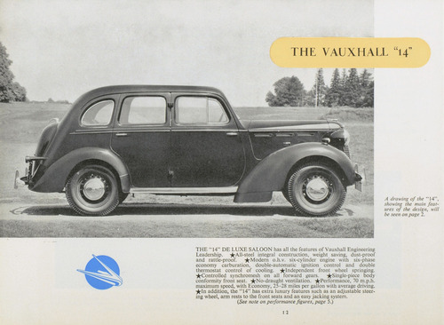 ... m THE VAUXHALL A drawing o f the “14”, showing the main feat ures o f the design, will be seen on page 2. THE “14” DE LUXE SALOON has all the features o f Vauxhall Engineering Leadership. ★Allsteel integral construction, weight saving, dustproof and rattleproof. ★Modern o.h.v. sixcylinder engine with sixphase economy carburation, doubleautomatic ignition control and double thermostat control o f cooling. ★Independent front wheel springing. -^-Controlled synchromesh on all forward gears. -^-Singlepiece body conformity front seat. -^-Nodraught ventilation. ★Performance, 70 m.p.h. maximum speed, with Economy, 25-28 miles per gallon with average driving. ★In addition, the “14” has extra luxury features such as an adjustable steer ing wheel, arm rests to the front seats and an easy jacking system. (See note on performance figures, page 5.) I 2 ...