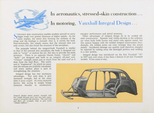 ... aeronautics, stressedskin construction ... In motoring, Vauxhall Integral Design ... Stressed skin construction enables modern aircraft to carry bigger loads over greater distances at higher speeds. As the name implies, the metal skin forming the surfaces of the wings and the fuselage is stressed—that is, it carries the load. Nontechnically, this simply means that the stressed skin not only covers, but also forms the structure of the aeroplane. The principle behind the integralbuilt Vauxhall is similar to that o f the stressed skin aeroplane; the body is designed not only to “cover” or enclose the car, but also to provide the main structure. There is no separate chassis frame, “chassis” and “body” are designed and built as an integral, allsteel unit. “Chassis” strength comes just as much from the steel roof as it does from the steel floor. The entire unit is “engineered”, by which we mean that the stresses are carefully calculated, and every section plays a part in strengthening the structure. Integral design has two enormous advantages. Not only does it give increased strength, but at the same time it saves weight. As every motorist knows, this saving in weight brings immense benefits in acceleration, topgear performance and petrol economy. Other advantages of integral design lie in its welded allsteel construction. Squeaks and rattles develop ...