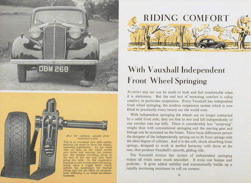 ... the infinitely variable front suspension works This is an overhead view with certain sections cut away to show the simple, operating mechanism. As the wheel rises or falls, so the wheel carrier arm twists and untwists the torsion bar, the stresses travelling along to the end of the bar and then back along the tube. In the suspension housing is a precompressed coil spring, acting upon a toggle lever, which softens the suspension for normal riding and has the effect o f progress ively stiffening it as wheel movement increases. / R ID IN G COM FORT With Vauxhall Independent Front Wheel Springing A lmost any car can be made to look and feel comfortable when it is stationary. But the real test o f motoring comfort is riding comfort, in particular suspension. Every Vauxhall has independent front wheel springing, the modern suspension system which is now fitted to practically every luxury car the world over. With independent springing the wheels are no longer connected by a solid front axle; they are free to rise and fall independently of one another (see top left). There is considerably less “unsprung” weight than with conventional springing and the steering gear and linkage can be mounted on the frame. These basic differences permit the designer of the independently sprung car to fit front springs with the ideal degree o f softness. And it is the ...