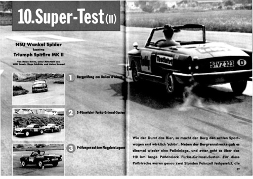... Wankel Spider kontra Triumph Spitfire MK II Von Heini Kram, unter Mitarbeit van Willi Lanak, Huao Schörrie und Anton Konrad Bergprüfung am Ballon 3-Pässefahrt Furka-Grimsel-Su Prüfungen auf dem Flugplatz Lugano Wie der Durst das Bier, so macht der Berg den echten Sport* wagen erst wirklich 'schön*. Neben der Bergrennstrecke gab es diesmal wieder eine Paßeinlage, und zwar geht es über das 110 km lange Paßdreieck Furka-Grimsel-Susten. Für diese Paßstrecke waren genau zwei Stunden Fahrzeit festgesetzt, die 77 ...