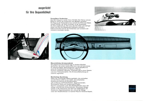 ... für ihre Bequemlichkeit Verstellbare Vordersitze Man fährt bequem in einem Volvo 121/122S. Der Fahrer und sein Mitfahrer können die Vordersitze nach Belieben verstellen. Die Neigung der Rückenlehne kann schnell mit Hilfe eines Hebels verstellt werden, der leicht erreichbar an der Aussenseite der Sitze angebracht ist. Man kann den Sitz höher und niedriger stellen und auch die Neigung des Sitzkissens verändern. Selbstverständlich können die Vordersitze auch vorwärts und rückwärts verschoben werden. Übersichtliches Armaturenbrett Das elegante Armaturenbrett liegt im direkten Blickfeld des Fahrers. Mit einem raschen Blick kann man die Instrumente für Geschwindigkeit, Motortemperatur und Kraftstoffvorrat sowie die Kontrolleuchten für Batterie, Öldruck, Fernlicht und Blinker übersehen. Ausserdem gibt es einen Gesamtund einen Teilstreckenzähler. Die Armaturenbeleuchtung ist stufenlos regulierbar. Reichhaltige Ausrüstung Neben den reichhaltigen Bedienungshebeln, die unmittelbar mit dem Fahren selbst zu tun haben, wie Lichtschalter, Kaltstartvorrichtung und Scheibenwischer, gibt es Heizung und Frischluftzufuhr, Zigarrenanzünder, Aschenbecher sowie eine Aussparung für Radio. Platz für Lautsprecher unter dem Rückblickfenster und in der Ablage unterhalb des Armaturenbretts. Die grossen Ablage taschen in den Seitentüren sind ideal zum Aufbewahren von ...