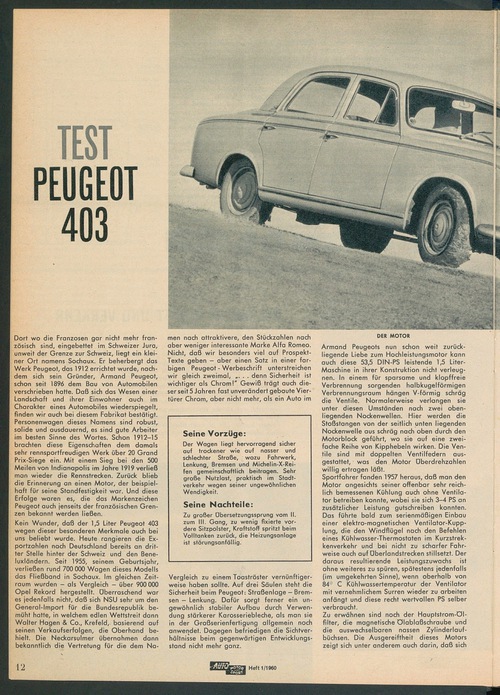 ... Gren zen bekannt werden ließen. Kein Wunder, daß der 1,5 Liter Peugeot 403 wegen dieser besonderen Merkmale auch bei uns beliebt wurde. Heute rangieren die Ex portzahlen nach Deutschland bereits an drit ter Stelle hinter der Schweiz und den Bene luxländern. Seit 1955, seinem Geburtsjahr, verließen rund 700 000 Wagen dieses Modells das Fließband in Sochaux. Im gleichen Zeit raum wurden - als Vergleich - über 900 000 Opel Rekord hergestellt, überraschend war es jedenfalls nicht, daß sich NSU sehr um den General-Import für die Bundesrepublik be müht hatte, in welchem edlen Wettstreit dann Walter Hagen & Co., Krefeld, basierend auf seinen Verkaufserfolgen, die Oberhand be hielt. Die Neckarsulmer übernahmen dann bekanntlich die Vertretung für die dem Na ■* I.' . f: * S w *V T» _______ men nach attraktivere, den Stückzahlen nach aber weniger interessante Marke Alfa Romeo. Nicht, daß wir besonders viel auf Prospekt- Texte geben - aber einen Satz in einer far bigen Peugeot - Werbeschrift unterstreichen wir gleich zweimal, . . denn Sicherheit ist wichtiger als Chrom!" Gewiß trägt auch die ser seit 5 Jahren fast unverändert gebaute Vier türer Chrom, aber nicht mehr, als ein Auto im Seine Vorzüge: Der Wagen liegt hervorragend sicher auf trockener wie auf nasser und schlechter Straße, wozu Fahrwerk, Lenkung, Bremsen und ...