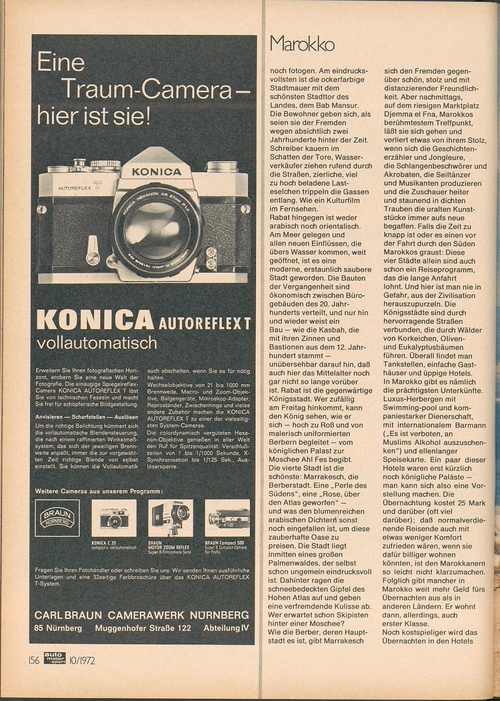 ... Spitzenqualität. Verschluß weite anpaßt, immer die zur vorgewähl- Zeiten von 1 bis 1/1000 Sekunde, X- ten Zeit richtige Blende von selbst Synchronisation bis 1/125 Sek., Auseinstellt. Sie können die Vollautomatik lösersperre. Weitere Cameras aus unserem Programm: KONICA C 35 BRAUN BRAUN Compact 5D0 compocfu.volloutomotisch MOTOR ZOOM REFLEX Super 8 Compoct-Comera Super 8-Filmcomero-Serie für Profis 'SSr» Fragen Sie Ihren Fotohändler oder schreiben Sie uns. Wir senden ihnen ausführliche Unterlagen und eine 32seitige Farbbroschüre über das KONICA AUTOREFLEX T-System. CARL BRAUN CAMERAWERK NÜRNBERG 85 Nürnberg Muggenhofer Straße 122 Abteilung IV noch fotogen. Am eindrucks vollsten ist die ockerfarbige Stadtmauer mit dem schönsten Stadttor des Landes, dem Bab Mansur. Die Bewohner geben sich, als seien sie der Fremden wegen absichtlich zwei Jahrhunderte hinter der Zeit. Schreiber kauern im Schatten der Tore, Wasser verkäufer ziehen rufend durch die Straßen, zierliche, viel zu hoch beladene Last eselchen trippeln die Gassen entlang. Wie ein Kulturfilm im Fernsehen. Rabat hingegen ist weder arabisch noch orientalisch. Am Meer gelegen und allen neuen Einflüssen, die übers Wasser kommen, weit geöffnet, ist es eine moderne, erstaunlich saubere Stadt geworden. Die Bauten der Vergangenheit sind ökonomisch zwischen Büro gebäuden des 20. Jahr ...