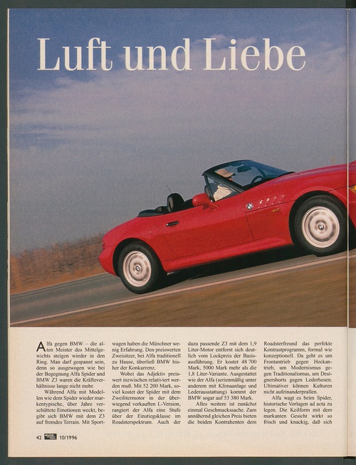 ... das perfekte Kontrastprogramm, formal wie konzeptionell. Da geht es um Frontantrieb gegen Heckan trieb, um Modernismus ge gen Traditionalismus, um Desi gnershorts gegen Lederhosen. Ultimativer können Kulturen nicht aufeinanderprallen. Alfa wagt es beim Spider, historische Vorlagen ad acta zu legen. Die Keilform mit dem markanten Gesicht wirkt so frisch und knackig, daß sich Alfa gegen BMW - die alten Meister des Mittelgewichts steigen wieder in den Ring. Man darf gespannt sein, denn so ausgewogen wie bei der Begegnung Alfa Spider und BMW Z3 waren die Kräftever hältnisse lange nicht mehr. Während Alfa mit Model len wie dem Spider wieder mar kentypische, über Jahre ver schüttete Emotionen weckt, be gibt sich BMW mit dem Z3 auf fremdes Terrain. Mit Sport wagen haben die Münchner we nig Erfahrung. Den preiswerten Zweisitzer, bei Alfa traditionell zu Hause, überließ BMW bis her der Konkurrenz. Wobei das Adjektiv preis wert inzwischen relativiert wer den muß. Mit 52 200 Mark, so viel kostet der Spider mit dem Zweilitermotor in der über wiegend verkauften L-Version, rangiert der Alfa eine Stufe über der Einstiegsklasse im Roadsterspektrum. Auch der dazu passende Z3 mit dem 1,9 Liter-Motor entfernt sich deut lich vom Lockpreis der Basisausfuhrung. Er kostet 48 700 Mark, 5000 Mark mehr als die 1,8 Liter-Variante. Ausgestattet ...
