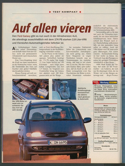 ... 100 Kilo gramm mehr auf die Waage. Im normalen Fährbetrieb fallen die Unterschiede zum konventionellen Antriebsprin zip recht gering aus. Allein beim Rangieren in engen Parklücken bemerkt man an Verspannungen im Antriebs strang, daß man es mit einem 4x4 zu tun hat. Wer den Galaxy aufs Glatteis führt, spürt außer dem, daß die Kraft an alle vier Räder weitergeleitet wird. Das Durchdrehen der Räder in kriti schen Situationen verhindert Hektische Schaltvorgänge kennzeichnen die elektro nisch gesteuer te Automatik Der VR6-Motor er weist sich im schweren Ga laxy 4x4 als sehr durstig zusätzlich die elektronische Antriebsschlupfregelung, die zur Serienausstattung zählt. Serienmäßig gibt es für den 4x4 auch die Vierstufen-Automatik. die mit ihren hektischen Schaltmanövem beim Fahrer schnell den Wunsch nach ei ner Handschaltung aufkommen läßt, um den passenden Gang selbst zu wählen. Auch der VR6-Motor von VW kann nicht ganz überzeugen. Von einem sonoren Sechszylinder-Klang ist hier nichts zu hören, das Triebwerk liegt den Passagieren schon bei geringen Drehzahlen vernehmlich in den Ohren. 4400 Mark kostet der Ga laxy 4x4 mehr als der Front triebler - ein Aufpreis, der sich nur für diejenigen lohnt, die im Winter viel in den Bergen un terwegs sind. Birgit Priemer Wertung S3 Gutes Platzangebot, hohe Variabilität, gute Traktion auch bei ...
