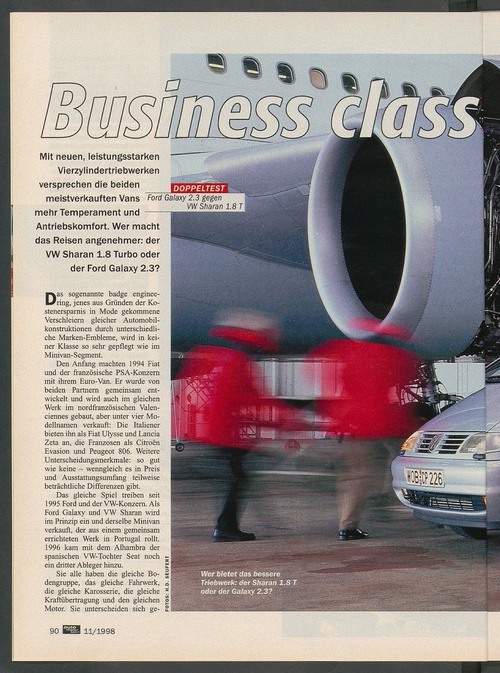 ... bietet das bessere Triebwerk: der Sharan 1.8 T oder der Galaxy 2.3? _____ Mit neuen, leistungsstarken Vierzylindertriebwerken versprechen die beiden meistverkauften Vans Ford Galaxy 2.3 gegen _ , VW Sharan 1mehr Temperament und Antriebskomfort. Wer macht das Reisen angenehmer: der VW Sharan 1.8 Turbo oder der Ford Galaxy 2.3? Das sogenannte badge engineering, jenes aus Gründen der Ko stenersparnis in Mode gekommene Verschleiern gleicher Automobil konstruktionen durch unterschiedli che Marken-Embleme, wird in kei ner Klasse so sehr gepflegt wie im Minivan-Segment. Den Anfang machten 1994 Fiat und der französische PSA-Konzem mit ihrem Euro-Van. Er wurde von beiden Partnern gemeinsam ent wickelt und wird auch im gleichen Werk im nordfranzösischen Valen ciennes gebaut, aber unter vier Mo dellnamen verkauft: Die Italiener bieten ihn als Fiat Ulysse und Lancia Zeta an, die Franzosen als Citroën Evasion und Peugeot 806. Weitere Unterscheidungsmerkmale: so gut wie keine - wenngleich es in Preis und Ausstattungsumfang teilweise beträchtliche Differenzen gibt. Das gleiche Spiel treiben seit 1995 Ford und der VW-Konzern. Als Ford Galaxy und VW Sharan wird im Prinzip ein und derselbe Minivan verkauft, der aus einem gemeinsam errichteten Werk in Portugal rollt. 1996 kam mit dem Alhambra der spanischen VW-Tochter Seat noch ein dritter Ableger hinzu. ...