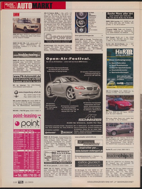 ... wmca JHP | ■ »IHM SM». s.rs 1 3 : - J. HE EZ km Anz. 1 wmwm IXi. .1 1 Touring km Anzl KZ 320 Ci Cabrio (E46), 1. Hd„ unf.fr., 2,2 Lit., 125 kW (170 PS), EZ 02.01, ca. 52000 km, TÜV 02.04, AU 02.04, schw., Voll-Leder schw., vollelektr. schw. Verd., 4x Airbags, LM-Räder m. Michelin 225, dazu Winterreif, auf Felgen, BC, Radio- CD, Park-Distance-Control, weiße Heckl., Alu-Blenden innen, EFH, ABS, Stabilitätskont., Klimaautom., ZV, el. Wegfahrsper re, Armaufl. vorn, Garag.fzg., sehr gepfl., VB 31.499,- Euro. Tel. 0172/3019572 od. 0711/182-1619 Z3 M-Coupe, 4.99, titansilber, Leder rot/ schwarz, CD, Klima, SD, Winterräder, gepfl. Garagenfzg., 49000 km, VB 28.900,-. 0172/6754526, 0681/6857331 ALPINA das ORIGINAL! Fabrikneue Komplett- Radsatze und Alpina- Zubehör zu Top- Konditionen. Fax 08141/44634 H bmwgebrauchtwagen.biz H BMW 325Ci A Coupe, Titansilbermet., Excl.leder Nappa schw., 03.02.2003, 10439 km, Clubsport, Autom., Navi, Kli maautom., EGSHD , Autotel. m. schnürt. Hörer, Xenon, 39.900,- €. BMW Group NL Düsseldorf, D. Neumann, Tel. 0211/9682-858, Fax 0211/9682882, www.bmwduesseldorf.de H Open-Air-Festival. Der Z4 von AC Schnitzer - schon bald bei Ihrem BMW-Partner. AC Schnitzer Sportauspuffanlage aus Edelstahl mit verchromten Endblenden im Racing Design AC Schnitzer C30 Kompressorleistungssteigerung für Z4 3.0i 217 kW {295 PS) AC ...