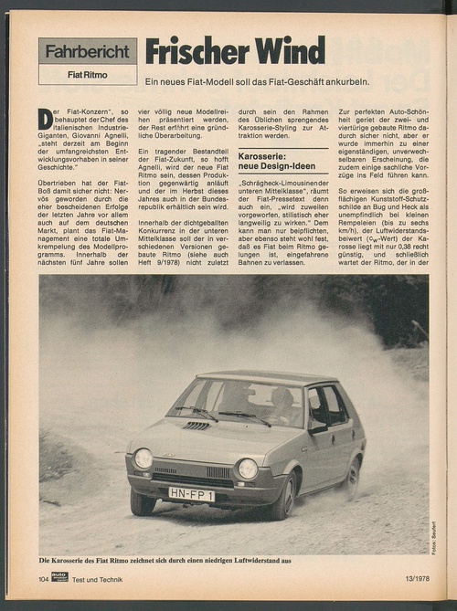 ... Fiat Ritmo Frischer Wind Ein neues Fiat-Modell soll das Fiat-Geschäft ankurbeln. Der Fiat-Konzern", so behauptet derChef des italienischen Industrie- Giganten, Giovanni Agnelli, „steht derzeit am Beginn der umfangreichsten Ent wicklungsvorhaben in seiner Geschichte.“ Übertrieben hat der Fiat- Boß damit sicher nicht: Ner vös geworden durch die eher bescheidenen Erfolge der letzten Jahre vor allem auch auf dem deutschen Markt, plant das Fiat-Ma nagement eine totale Umkrempelung des Modellpro gramms. Innerhalb der nächsten fünf Jahre sollen vier völlig neue Modellrei hen präsentiert werden, der Rest erfährt eine gründ liche Überarbeitung. Ein tragender Bestandteil der Fiat-Zukunft, so hofft Agnelli, wird der neue Fiat Ritmo sein, dessen Produk tion gegenwärtig anläuft und der im Herbst dieses Jahres auch in der Bundes republik erhältlich sein wird. Innerhalb der dichtgeballten Konkurrenz in der unteren Mittelklasse soll der in ver schiedenen Versionen ge baute Ritmo (siehe auch Heft 9/1978) nicht zuletzt durch sein den Rahmen des Üblichen sprengendes Karosserie-Styling zur At traktion werden. Karosserie: neue Design-Ideen „Schrägheck-Limousinender unteren Mittelklasse“, räumt der Fiat-Pressetext denn auch ein, „wird zuweilen vorgeworfen, stilistisch eher langweilig zu wirken." Dem kann man nur beipflichten, ...