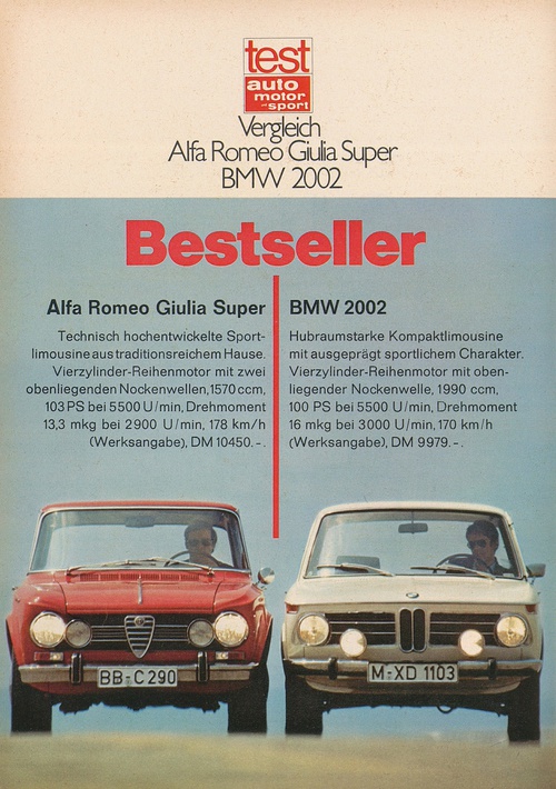 ... automotor -sport BMW 2002 Bestseller Alfa Romeo Giulia Super Technisch hochentwickelte Sport limousine aus traditionsreichem Hause. Vierzylinder-Reihenmotor mit zwei obenliegenden Nockenwellen, 1570ccm, 103PS bei 5500 U/min, Drehmoment 13,3 mkg bei 2900 U/min, 178 km/h (Werksangabe), DM 10450.-. BMW 2002 Hubraumstarke Kompaktlimousine mit ausgeprägt sportlichem Charakter. Vierzylinder-Reihenmotor mit oben liegender Nockenwelle, 1990 ccm, 100 PS bei 5500 U/min, Drehmoment 16 mkg bei 3000 U/min, 170 km/h (Werksangabe), DM 9979.-. XD 1103:BB-C290 «maiiroia / ...