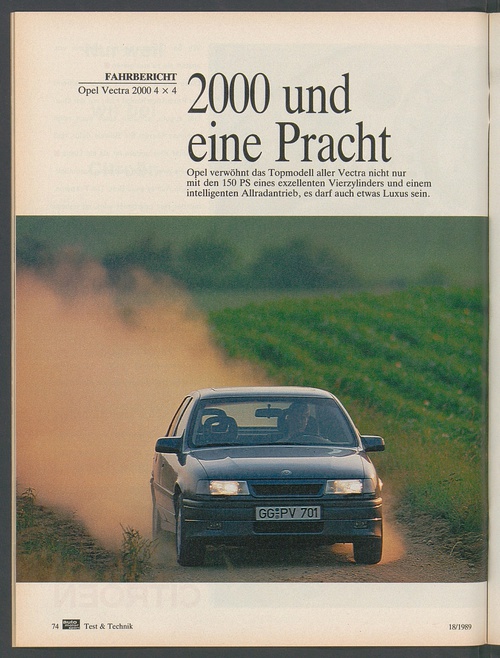 ... 701 mm r FAHRBERICHT Opel Vectra 2000 4 x4 2000 und eine Pracht Opel verwöhnt das Topmodell aller Vectra nicht nur mit den 150 PS eines exzellenten Vierzylinders und einem intelligenten Allradantrieb, es darf auch etwas Luxus sein. Test & Technik 18/1989 ...