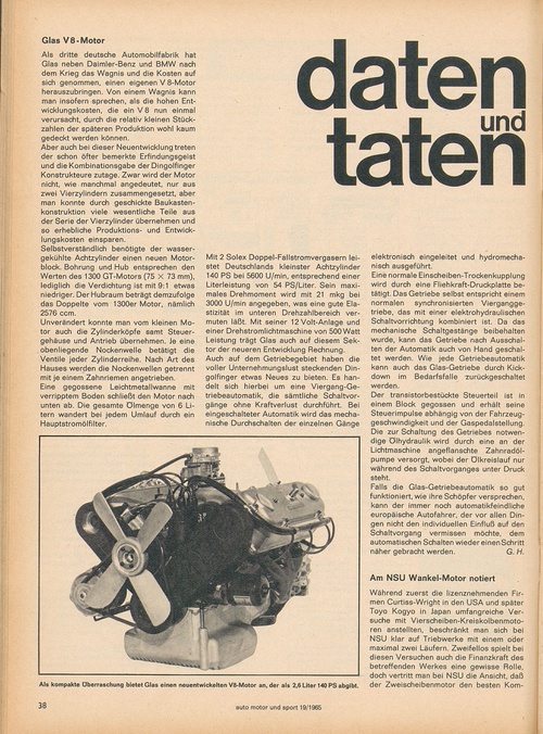 ... GT-Motors (75 X 73 mm), lediglich die Verdichtung ist mit 9:1 etwas niedriger. Der Hubraum beträgt demzufolge das Doppelte vom 1300er Motor, nämlich 2576 ccm. Unverändert konnte man vom kleinen Mo tor auch die Zylinderköpfe samt Steuer gehäuse und Antrieb übernehmen. Je eine obenliegende Nockenwelle betätigt die Ventile jeder Zylinderreihe. Nach Art des Hauses werden die Nockenwellen getrennt mit je einem Zahnriemen angetrieben. Eine gegossene Leichtmetallwanne mit verripptem Boden schließt den Motor nach unten ab. Die gesamte ölmenge von 6 Li tern wandert bei jedem Umlauf durch ein Hauptstromölfilter. Mit 2 Solex Doppel-Fallstromvergasern lei stet Deutschlands kleinster Achtzylinder 140 PS bei 5600 U/min, entsprechend einer Literleistung von 54 PS/Liter. Sein maxi males Drehmoment wird mit 21 mkg bei 3000 U/min angegeben, was eine gute Ela stizität im unteren Drehzahlbereich ver muten läßt. Mit seiner 12 Volt-Anlage und einer Drehstromlichtmaschine von 500 Watt Leistung trägt Glas auch auf diesem Sek tor der neueren Entwicklung Rechnung. Auch auf dem Getriebegebiet haben die voller Unternehmungslust steckenden Dingolfinger etwas Neues zu bieten. Es han delt sich hierbei um eine Viergang-Ge triebeautomatik, die sämtliche Schaltvor gänge ohne Kraftverlust durchführt. Bei eingeschalteter Automatik wird das mecha nische Durchschallen der ...