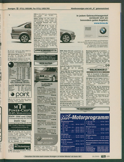 ... Gebrauchte Automobile im Internet 0180/318 (18 Pf/min) Freude am Fahren Schnell und einfach zum Wunschauto: Mehr als 50.000 Angebote mit EUROPIus-Garantie. Täglich aktuell: Gebrauchte Automobile, inkl. Geschäftsund Jahreswagen der BMW Group und BMW Partner. Z1, EZ 5.91, urgrün, Nr. 7640, 49000 km, DM 54.500,-. Tel. 06386/511B 328i Umbau Alpina, E46, Bj. 4.98, 29000 km, Silber, 18", Teil-Leder, Klima, GSD, FP 46.900,-. Tel. 06109/771117 Z1 Windschott o. Bohren (wie Z3) 348,-. Tel. 05661/2401, www.ksmweb.de H »Große Auswahl an PKW ohne WartezeitenPKW-Inzahlungnahme freie Händlerund Markenwahl1 3181 328i Coupe 330d A Touring 330i A Cabrio 528ÌA X54.4ÌA Z1 Z3 2.8 Roadster EZ M.00 neu 00 neu M.98 neu 92 99 KM AnzJDM Rat« DM 8' 14.999,- 486,- 24.999,- 597,- 24.999, - 874,- 24 999,- 1.095,- 14.999, - 558,- 29.999, - 1.560,- 14.999, - 392,- 14.999,- 426,- 60.000 lun in II Moniten weitere BMW - Angebote siehe Großanzeige: Mercedes Point Leasing und Handels GmbH Zentrale. München: 089 / 710 55-0 Hamburg Tel. 040 / 241 44-0 Berlin Tel. 030 / 88 71 09-0 Düsseldorf Tel. 0211 /32 30 57-0 Stuttgart Tel. 0711 /226471-0 530i, Bj. 89, Topzust., blaumet., Gawa., Schnitzer Umbau, 235/255, 85000 km, VB 13.000,-. Tel. 02695/638 mTh Power-Chip's 10-40% Mehrleistung BMW 330d und 530d Leistungssteigerung auf 234 PS BMW 740d Leistungssteigerung auf ...