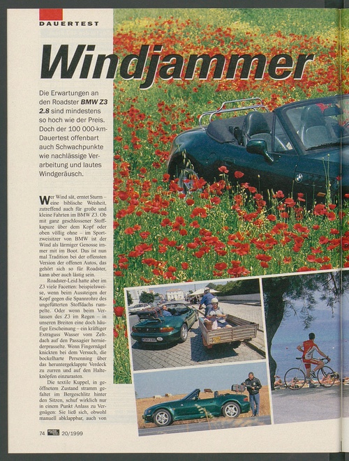 ... ERTEST Die Erwartungen an den Roadster BMWZ3 2.8 sind mindestens so hoch wie der Preis. Doch der 100 000-km- Dauertest offenbart auch Schwachpunkte wie nachlässige Ver arbeitung und lautes Windgeräusch. Wer Wind sät, erntet Sturm - eine biblische Weisheit, zutreffend auch für große und kleine Fahrten im BMW Z3. Ob mit ganz geschlossener Stoffkapuzc über dem Kopf oder oben völlig ohne - im Sport zweisitzer von BMW ist der Wind als lärmiger Genosse im mer mit im Boot. Das ist nun mal Tradition bei der offensten Version der offenen Autos, das gehört sich so für Roadster, kann aber auch lästig sein. Roadster-Leid hatte aber im Z3 viele Facetten: beispielswei se, wenn beim Aussteigen der Kopf gegen die Spannrohre des ungefütterten Stoffdachs rum pelte. Oder wenn beim Ver lassen des Z3 im Regen - in unseren Breiten eine doch häu fige Erscheinung - ein kräftiger Extraguss Wasser vom Zelt dach auf den Passagier hernie derprasselte. Wenn Fingernägel knickten bei dem Versuch, die bockeiharte Persenning über das heruntergeklappte Verdeck zu zurren und auf den Halte knöpfen einzurasten. Die textile Kuppel, in ge öffnetem Zustand stramm ge faltet im Bergeschlitz hinter den Sitzen, schuf wirklich nur in einem Punkt Anlass zu Ver gnügen: Sie ließ sich, obwohl manuell abklappbar, auch von 74 20/1999 ...