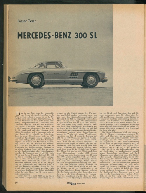 ... Sie brauchen von 0 bis 100 km/st 30 sec mit Ihrem Olympia Rekord? Der 300 SL hat in derselben Zeit 210 km/st erreicht! Und er frißt sie dabei auf, meinen Sie? Sie müssen schon konstante 160 km/st auf der Autobahn einhalten, wenn der SL 13 Liter pro 100 km verbrauchen soll. Natürlich kann er auch das Doppelte schlucken, dcnnn der Ver brauch hängt von der Leistung ab; aber es gibt im heutigen Straßenverkehr keine Möglichkeit mehr, die seine länger als für kurze Augen blicke auzunutzen. Dieses Auto über rund 3000 km zu fahren und seinem Temperament entsprechend zu bc- 16 wegen, war ein Erlebnis eigener Art. Wir wer den ausführlich darüber berichten, zuvor uns aber mit den Konstruktionsmerkmalen des Mercedes-Benz 300 SL eingehend befassen. Sein Herz ist der vom Typ 300 übernommene 6 Zylinder-Motor von 85 X 88 mm Bohrung und Hub (2996 ccm), dessen hängende Ven tile durch eine obenliegende Nockenwelle an getrieben werden. Durch die hier erstmals bei einem Serienwagen angewendete Benzin-Direkt einspritzung mittels einer Bosch-Einspritz pumpe im Verein mit einem Verdichtungs verhältnis von 8,55 : 1 wurde die Leistung auf 215 PS bei 5800 U/min mit der Sport-Nocken welle gebracht, was dem sehr hohen spezifi schen Wert von 71,5 PS/Liter entspricht. Die Einspritzdüsen liegen im oberen Teil der Zy linderwand, und zwar dort, wo sich beim nor malen 300-Motor ...