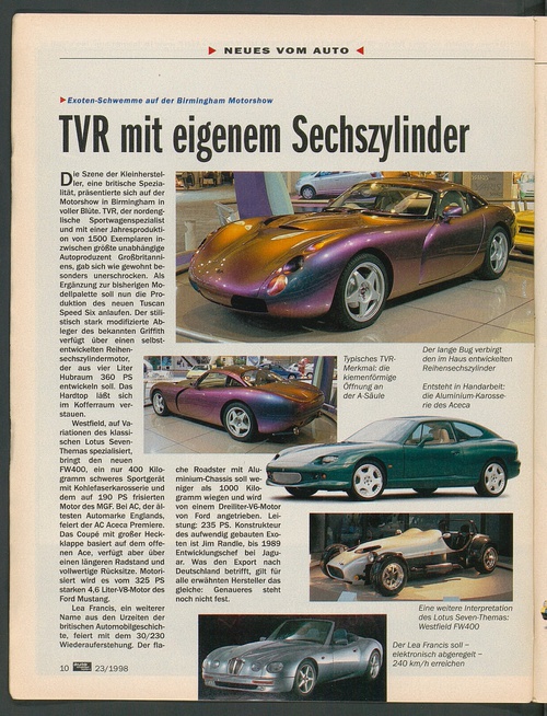 ... ? jj-, - ■KagK SL_ì_i- ^ NEUES VOM AUTO A ► Exoten-Schwemme auf der Birmingham Motorshow TVR mit eigenem Sechszylinder Die Szene der Kleinhersteller, eine britische Spezia lität, präsentierte sich auf der Motorshow in Birmingham in voller Blüte. TVR, der nordeng lische Sportwagenspezialist und mit einer Jahresprodukti on von 1500 Exemplaren in zwischen größte unabhängige Autoproduzent Großbritanni ens, gab sich wie gewohnt be sonders unerschrocken. Als Ergänzung zur bisherigen Mo dellpalette soll nun die Pro duktion des neuen Tuscan Speed Six anlaufen. Der stili stisch stark modifizierte Ab leger des bekannten Griffith verfügt über einen selbst entwickelten Reihen sechszylindermotor, der aus vier Liter Hubraum 360 PS entwickeln soll. Das Hardtop läßt sich im Kofferraum ver stauen. Westfield, auf Va riationen des klassi schen Lotus Seven- Themas spezialisiert, bringt den neuen FW400, ein nur 400 Kilo gramm schweres Sportgerät mit Kohlefaserkarosserie und dem auf 190 PS frisierten Motor des MGF. Bei AC, der äl testen Automarke Englands, feiert der AC Aceca Premiere. Das Coupé mit großer Heck klappe basiert auf dem offe nen Ace, verfügt aber über einen längeren Radstand und vollwertige Rücksitze. Motori siert wird es vom 325 PS starken 4,6 Liter-VS-Motor des Ford Mustang. Lea Francis, ein weiterer Name aus den Urzeiten der ...