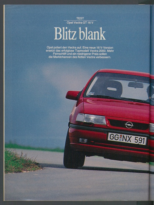 ... r \ TEST Opel Vectra GT16 V Blitz blank Opel poliert den Vectra auf. Eine neue 16 V-Version ersetzt das erfolglose Topmodell Vectra 2000. Mehr Feinschliff und ein niedrigerer Preis sollen die Marktchancen des flotten Vectra verbessern. ...