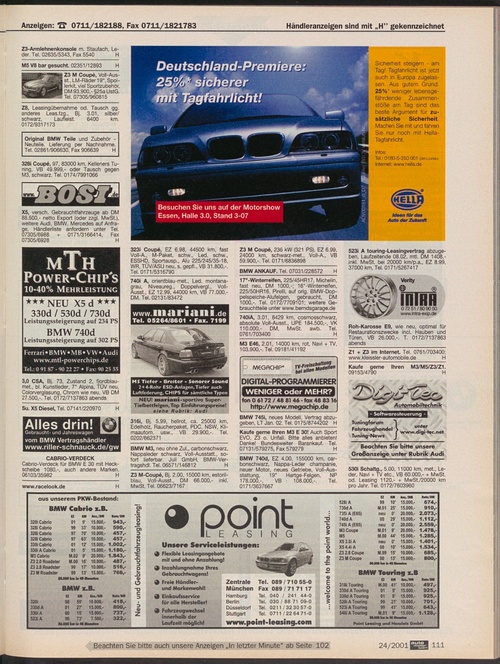 ... am Tag sind das beste Argument für zu sätzliche Sicherheit Machen Sie mit und fahren Sie nur noch mit Hella- Tagfahrlicht. Infos: Tel.:0180-5-250 001 (OM o.mm< Internet: www.hella.de HELLE mTh Power-Chip's 10-40% Mehrleistung *** NEU X5 d *** 330d / 530d / 730d Leistungssteigerung auf 234 PS BMW 740d Leistungssteigerung auf 302 PS Ferrari BMW »MB» VW» Audi www.mtI-powerchips.de Tel.: 0 91 87 - 90 22 27 Fax: 90 25 55 3,0 CSA, Bj. 73, Zustand 2, fjprdblaumet., bl. Kunstleder, 7" Alpina, TÜV neu, Colorverglasung, Chrom wie neu, VB DM 27.500,-. Tel. 0172/7137863 abends Su. X5 Diesel, Tel. 07141/220970 H Alles drin! CT Gebrauchtund Jahreswagen | vom BMW Vertragshändler www.rillerschnauck.de/gw CABRIO-VERDECK Cabrio-Verdeck für BMW E 30 mit Heck scheibe 1080.-, auch andere Marken. 06103/35982 H www.racelook.de H 323i Coupe, EZ 6.98, 44500 km, fast Voll-A., M-Paket, schw., Led. schw., ESSHD, Sportausp., Alu 225/245/35-18, WR, TÜV/ASU neu, s. gepfl., VB 31.800,-. Tel. 0171/5316790 740i A, orientblaumet., Led. montana grau, Niveaureg., Doppelvergl., Voll- Ausst., EZ 12.99, 44000 km, VB 77.000,- DM. Tel. 02131/83472 WWW. mar iani.de Tel. 05264/8601 Fax. 7199 316i, Bj. 5.99, hellrot, ca. 25000 km, Edelholz, Raucherpaket, PDC, NSW, Klimaautom. usw., VB 29.900,-. Tel. 0202/662371 BMW M3, neu ohne Zul., carbonschwarz, ...