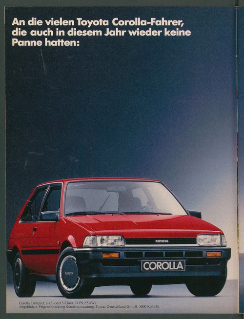 ... COROLLA TOYOTA Corolla Compact, als 3- oder 5-Türer. 74 PS (55 kW). Abgcbildete Felgenabdeckung Sonderausstattung. Toyota Deutschland GmbH, 5000 Köln 40. An die vielen Toyota Corolla-Fahrer, die auch in diesem Jahr wieder keine Panne hatten: P - . mm. ...