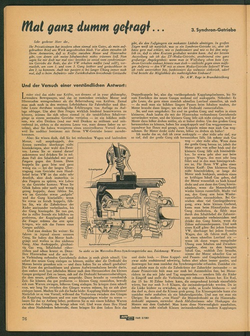... letzten Ausstellung sah ich das ZF-Media-Getriebe, anscheinend eine ganz großartige Angelegenheit: wenn man in Wolfsburg schon kein Syndnon-Getriebe einbaut,könnte man doch — vielleicht gegen einen mäßi gen Aufpreis — den VW mit so einem Media-Getriebe liefern?! Wenn ich recht unterrichtet bin, funktioniert das teilweise elektrisch, oder? Und besteht die Möglichkeit des nachträglichen Einbaues? Dr. A.W. Rage in Brunsbüttelkoog Leider sind das nidit nur Kräfte, not dreamt of in your philosophy, sondern Bewegungen, und das ist zumindest zwischen Motor und Hinterachse unangenehmer als die Beherrschung von Kräften. Zumal man auch noch in den meisten Lehrbüchern für Fahrschüler und ähn liche Leute durchaus unzulängliche Erklärungen von Auflage zu Auf lage schleppt. Um aber Ihre Fragen wirklich bindend beantworten zu können, müssen Sie sich schon einmal in die tatsächlichen Sdialtvorgänge in einem normalen Getriebe vertiefen — ist ein bißchen müh sam, wie alles Denken (und nur weil Denken so mühsam und zeit raubend ist, ziehen es die meisten Leute vor, statt dessen lieber zu ur teilen), aber Sie haben wenigstens einen unmittelbaren Vorteil davon, weil Sie nachher bestimmt mit Ihrem VW-Getriebe besser zurecht kommen. Also: Sie wissen doch, daß Sie bei stehendem Wagen und laufendem Motor, voll ausgekuppelt, den Ersten zuweilen überhaupt nicht hineinkriegen, ...