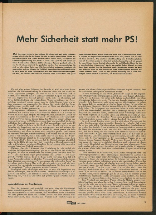 ... so und wird auch so bleiben. Indes braucht man bei allem gebührenden Respekt vor dem, was von den Ingenieuren laufend geleistet wird, nicht zu übersehen, daß deren Schlüsselstellung die folgerichtige Weiterentwicklung im Auto mobilbau manchmal ebenso hemmt oder in falsche Bahnen lenkt, wie sie diese normalerweise vorantreibt. Der Grund liegt darin, daß der Auto mobilingenieur weithin noch viel zu sehr im Sinne des klassischen Ma schinenbaus zu denken gewohnt ist. Das sogenannte „PS-Rennen“, das schon seit Jahren in Amerika ebenso stattfindet wie —wenn auch in verkleinertem Maßstab — in Europa, ist hierfür ein sinnfälliges Beispiel. Alle Möglichkeiten, die sich auf Grund der jüngsten Erkenntnisse in der Werkstoff-, Produktionsoder Kraftstoff technik auswerten lassen, dienen dazu, den Motoren immer höhere Lei stungen abzuringen, in PS-Zahlen zu schwelgen und schließlich die haupt sächlichste Entwicklungsarbeit auf das Ziel auszurichten, noch mehr PS unter der Haube zu haben als die Konkurrenz. Gewiß gehört es zu den Aufgaben des Ingenieurs, das logisch auszuwerten, was auf anderen Ge bieten der Technik geschaffen wird. Gewiß ist ferner gerade die hohe Motorleistung, vor allem in Form einer möglichst großen Kraftreserve, ein eminent wichtiger Sicherheitsfaktor; indes wurde hier in den letzten Jahren so viel erreicht, daß es nicht mehr sinnvoll sein kann, ...