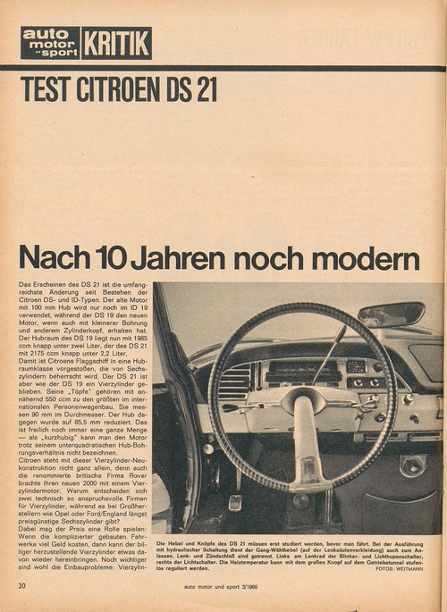 ... motor“"4sport KRITIK TEST CITROEN DS 21 Nach 10 Jahren noch modern Das Erscheinen des DS 21 ist die umfang reichste Änderung seit Bestehen der Citroen DS- und ID-Typen. Der alte Motor mit 100 mm Hub wird nur noch im ID 19 verwendet, während der DS 19 den neuen Motor, wenn auch mit kleinerer Bohrung und anderem Zylinderkopf, erhalten hat. Der Hubraum des DS 19 liegt nun mit 1985 ccm knapp unter zwei Liter, der des DS 21 mit 2175 ccm knapp unter 2,2 Liter. Damit ist Citroens Flaggschiff in eine Hub raumklasse vorgestoßen, die von Sechs zylindern beherrscht wird. Der DS 21 ist aber wie der DS 19 ein Vierzylinder ge blieben. Seine „Töpfe“ gehören mit an nähernd 550 ccm zu den größten im inter nationalen Personenwagenbau. Sie mes sen 90 mm im Durchmesser. Der Hub da gegen wurde auf 85,5 mm reduziert. Das ist freilich noch immer eine ganze Menge — als „kurzhubig“ kann man den Motor trotz seinem unterquadratischen Hub-Bohrungsverhältnis nicht bezeichnen. Citroen steht mit dieser Vierzylinder-Neu konstruktion nicht ganz allein, denn auch die renommierte britische Firma Rover brachte ihren neuen 2000 mit einem Vier zylindermotor. Warum entscheiden sich zwei technisch so anspruchsvolle Firmen für Vierzylinder, während es bei Großher stellern wie Opel oder Ford/England längst preisgünstige Sechszylinder gibt? Dabei mag der Preis eine Rolle ...