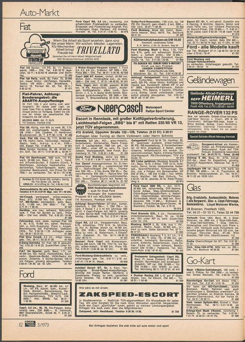 ... eine der letzten zum sensationellen Räu mungspreis von DM 156,50. NDLDEKE GMBH, Abt. Fl 5A/S, 775 Konstanz, Postfach 5130 Flat 128, 4türlg, von WA zu verk. B). 7.72, 8500 km, positanogelb, helzb. Hecksch., VB 5700.- DM. Lindner, 71 Hellbronn, Bruckmannstr. 22, T. 0 71 36 / 4 78. 61 489 Verk. Flat 128, blau, BJ. 7.71, 26 000 km, 62 PS, Hohlr.-Vers., Verbundgl., Heizsch., Radio, Instr., H-4-Lp. u. v. m., 5100.— DM, Essen Tel. 77 85 68. 61 601 Dlno Spider Hardtop, BJ. 69, 40 000 km, div. Extr. Tel. 04 11 / 5 51 84 08 u. 82 96 71. 61 457 Flat 124 Sportcoupä, 1600 ocm, 110 PS, weiß, 38 000 km, Bauj. 71, aus 1. Hand, mit 3-Punkt-Gurten, 4 Cosmic 5V2X13, 5 Stahlfelgen, heizbare Heckscheibe, Le derlenkrad, Talbot-Splegeln, techn. und optischer Bestzustand, von Privat für DM 7500.- zu verkaufen. Tel. 02 51 /79 13 86. 61 470 Hardtops für Flat Spider 850, einfach o. Steillg. Für Flat Spider 124, 3telllg. KÖRBIER ■ 8114 Ufflng 30 Tel. 0 88 46/2 93 Gebrauchttella für alle Flat-Cabrlo H Telefon 0 71 21/3 37 81 Mgl. von 17—19 Uhr. 124-Coupé, werksgepfl., sllbermetalllc, Bauj. 2/72, 10 500 km, DM 3500.- unter NP. 850-Splder, werksgepfl., gelb, Bauj. 6.72, 11 000 km, DM 6500.-. Tel. HN 0 71 31 / 7 96 43. 61 087 Hardtop, wie neu, schwarz, Schrumpf lack, f. Flat 124 Spider zu verk., Preis 990.- DM Inkl. MWSt. Tel. 0 55 33 / 20 66. 61 368 Fahrverbot, verk. desh. meinen ...