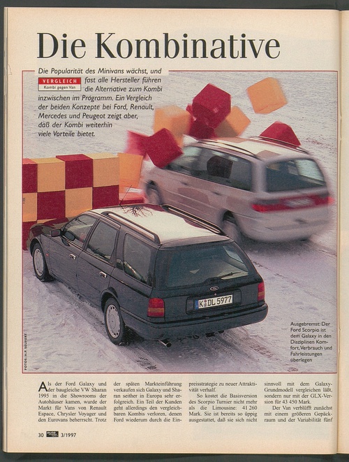 ... TO S: H .P. S EU FE RT Die Kombinative Ausgebremst: Der Ford Scorpio ist dem Galaxy in den Disziplinen Kom fort,Verbrauch und Fahrleistungen überlegen s* Die Popularität des Minivans wächst, und WTHHHW fast alle Hersteller führen I Kombi gegen_Van_J fa /\hernapVe zum Kombi inzwischen im Programm. Ein Vergleich der beiden Konzepte bei Ford, Renault, Mercedes und Peugeot zeigt aber, daß der Kombi weiterhin viele Vorteile bietet. Als der Ford Galaxy und der baugleiche VW Sharan 1995 in die Showrooms der Autohäuser kamen, wurde der Markt fur Vans von Renault Espace, Chrysler Voyager und den Eurovans beherrscht. Trotz der späten Markteinführung verkaufen sich Galaxy und Sha ran seither in Europa sehr er folgreich. Ein Teil der Kunden geht allerdings den vergleich baren Kombis verloren, denen Ford wiederum durch die Ein preisstrategie zu neuer Attrakti vität verhalf. So kostet die Basisversion des Scorpio Turnier nicht mehr als die Limousine: 41 260 Mark. Sie ist bereits so üppig ausgestattet, daß sie sich nicht sinnvoll mit dem Galaxy- Grundmodell vergleichen läßt, sondern nur mit der GLX-Ver sion für 43 450 Mark. Der Van verblüfft zunächst mit einem größeren Gepäck raum und der Variabilität fünf _ 30 3/1997 ...