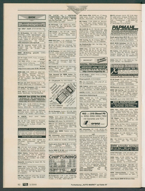 ... 63.800,- 750iA, 06/98. 10 tkm. orientblau/Leder. Voll+Nav. 99.76Ü,- http://\v\vw.varex.com 02 08 / 58 83 88 BMW 328i, 3.99, 16900 km, silbermet., Led., Sportsi., "Schnitzer“, Klimatron., Navi, SSD, RC, Sitzhzg., Color 2 V., Frontspoil.. Fahrw. 18" Alu, Schweller, NP üb. 104.000.-, DM 68.900.-. Tel. 06172/34020 H M3 Lim. 3,2, SMG Getriebe, 3.97, 1. Hd., 49.400,- MwSt. awb. 07145/900090 H 316 open Air Compact, 4.96, rot, 58000 km, 25.800,-. Tel. 02431/7983 Verk. 528 A, Voll-Ausstattung, Bj. 4.97, MwSt., VB 52.000,-. Tel. 09179/97200 ANKAUF 5er (E39) 7er (E38) ab Baujahr '94 - '98 Selbstabholung HAUG HANDELS GMBH MÜNCHEN Telefon 089/89 12 24 0 » Fax 8144151 530 D, anthr., 10.98, 27000 km, Klimaautom., PC. Mulifunktionslenkr., CD- Wechsl., VB 62.000,-. Tel. 02271/96524 850Ci, Mod. 93, 115000 km, sterlingsil ber/Leder schw., Voll-A., alle KD’s, 1a Zustand, v. NT, 49.900,-. 0521/479428 M 635CSi, Anruf lohnt! Telefon 0172/2707531 Z3, 2,8, EZ 2.98, 22000 km, Roadster, schw.-met., Led., Klima, Voll-Ausst. + Schnitzer u.v.m., 1a Zust., 47.000,-. Tel. 0171/3718860 Barankauf! Anruf gebührenfrei I Exportfirma kauft PKW und Geländewagen I I mit vielen km, Unfallund Motorschäden. 1 ITel. 0800/7592652 . Fax 0251/2110171 www.autoankauf.com 540i, orientbl.-met.. 6.97, 110000 km, Voll-Ausst., Scheckheft. VB 48.400 ...