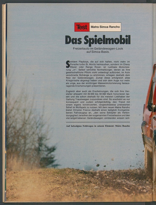 ... I Matra Simca Ranchöj Das Spielmobil Freizeitauto im Geländewagen-Look auf Simca-Basis. Seitdem Playboys, die auf sich halten, nicht mehr im Porsche turbo St. Moritz heimsuchen, sondern im Chevy Blazer oder Range Rover, ist rustikale Motorisierung „in“. Selbst schlichte Normalbürger, denen es ihre gesellschaftliche Pflicht nicht unbedingt aufbürdet, im Auto verschneite Skihänge zu erklimmen, erliegen deshalb dem Reiz der Geländewagen. Zumal diese erfolgreich alles Kriegerische abgelegt haben und sich dem Auge nur mehr als urige, aus der eintönigen Massenmotorisierung heraus ragende Erscheinungen präsentieren. Zugleich aber auch als Erscheinungen, die sich ihre Her steller allesamt mit 20 000 bis 50 000 Mark honorieren las sen und die schon deshalb für die meisten Liebhaber der Gattung Traumwagen zuzuordnen sind. So erscheint es nur konsequent und zudem erfolgsträchtig, den Trend mit einem eigens konstruierten, vergleichsweise preiswerten Schaf im Wolfspelz zu nutzen: Mit dem neuen Matra Rancho bietet Chrysler France deshalb einen lediglich frontgetrie benen Fahrzeugtyp an, „den seine Schöpfer als Verbin dungsglied zwischen den sogenannten Freizeitautos und den vierradgetriebenen Geländewagen verstanden wissen wol- Auf befestigten Feldwegen in seinem Element: Matra Rancho ...