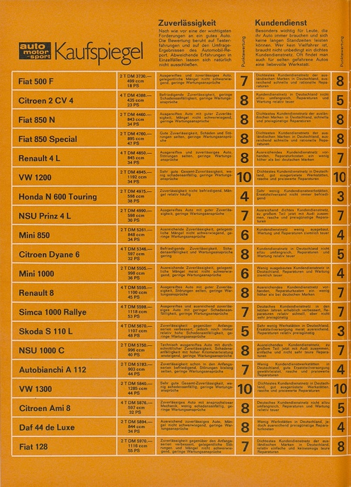 ... ansprüche 8 Kundendienstnetz in Deutschland nicht allzu umfangreich, Reparaturen und Wartung relativ teuer 5 Fiat 850 N 2 T DM 4460.— 843 ccm 34 PS Ausgereiftes Auto mit guter Zuverläs sigkeit. Mängel nicht schwerwiegend, geringe Wartungsansprüche 8 Dichtestes Kundendienstnetz der auslän dischen Marken in Deutschland, schnelle und preisgünstige Reparaturen 8 Fiat 850 Special 2 T DM 4760.— 895 ccm 47 PS Gute Zuverlässigkeit, Schäden und Stö rungen selten, geringe Wartungsansprü che 8 Dichtestes Kundendienstnetz der aus ländischen Marken in Deutschland, aus reichend schnelle und rationelle Repa raturen 0 0 Renault 4 L 4 T DM 4850.— 845 ccm 34 PS Ausgereiftes und zuverlässiges Auto, Störungen selten, geringe Wartungs ansprüche 8 Ausreichendes Kundendienstnetz vor handen, Reparaturkosten ein wenig höher als bei deutschen Marken 7 VW 1200 2 T DM 4945.— 1192 ccm 34 PS Sehr gute Gesamt-Zuverlässiakeit, we nig schadensanfällig, geringe Wartungs ansprüche 10 Dichtestes Kundendienstnetz in Deutsch land, gut ausgerüstete Werkstätten, rasche und preiswerte Reparaturen 10 Honda N 600 Touring 2 T DM 4975.— 598 ccm 38 PS Zuverlässigkeit nicht befriedigend, Män gel relativ häufig 4 Sehr wenig Kundendienstwerkstätten, Ersatzteilversand nicht immer befriedi gend 3 NSU Prinz 4 L 2 T DM 4990.— 598 ccm 30 PS Ausgereiftes Auto mit guter Zuverläs sigkeit, geringe ...