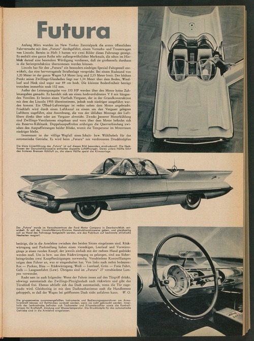 ... 8 mit hängen den Ventilen. Er besitzt einen Vierfach-Vergaser, der in der Grundkonstruktion mit dem des Lincoln 1955 übereinstimmt, jedoch noch niedriger ausgeführt wer den konnte. Ein Ölbad-Luftreiniger ist rechts neben dem Motor angebracht. Frischluft wird durch einen Luftkanal zu einem um den Vergaser gelegten Lufthorn zugeführt, eine Anordnung, die von der üblichen Montage des Luft filters direkt über oder am Vergaser abweicht. Zwecks besserer Motorkühlung sind Zwillings-Ventilatoren eingebaut und vorn über dem Motor befindet sich ein Reserve-Kühltank. Doppelauspuffrohre erübrigen die Querverbindung zwi schen den Auspuffleitungen beider Blöcke, womit die Temperatur im Motorraum niedriger bleibt. Interessant ist der völlige Wegfall eines Schaltbzw. Wählhebels für das automatische Getriebe. Es wird beim „Futura“ mit verchromten Druckknöpfen Die klare Linienführung des „Futura" ist auf diesem Bild besonders eindrucksvoll. Die Heckflossen der Ganzstahlkarosserie enthalten doppelte Luftöffnungen. Deren untere Hälfte führt den hinteren Bremsen Kühlluft zu, die obere Hälfte speist die Klimaanlage. 'rn ■ 1 1 Der „Futura* wurde im Versuchszentrum der Ford Motor Company in Dearborn/Mich. entwickelt. Er soll der Lincoln/Mercury-Division Konstruktionshinweise geben, und gleichzeitig soll an Hand des Fahrzeugs festgestellt werden, wie das Publikum ...