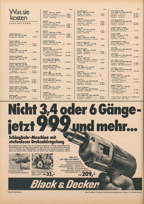 ... 31 620.— DM Daf 33 (2 Zyl., 746 ccm, 28 PS) Limousine, zweitürig............ 4 695.— De Luxe Limousine, zweitürig 4 995.— Kombi, zweitürig ................ 5 295.— Daf 44 (2 Zyl., 844 ccm, 34 PS) Limousine, zweitürig............. 5 594.— De Luxe Limousine, zweitürig 5 894.— Kombi, zweitürig ................ 6 294.— Daf 55 (4 Zyl., 1108 ccm, 45 PS) De Luxe Limousine, zweitürig 6 294.— Coupé, zweitürig ................ 6 993.— Kombi, zweitürig ................ 6 693.— Daf 55 Marathon (4 Zyl., 1108 ccm, 55 PS) Limousine, zweitürig .. ca. 7 000.— Daimler 2,8 (6 Zyl., 2792 ccm, 149 PS) De Luxe Limousine, viertürig mit Overdrive .. 27 400.— De Luxe Limousine, viertürig mit Automatik .. 28 200.— De Tomaso Mangusta (V 8, 4728 ccm, 305 PS) Coupé, zweitürig ................ 58 900.— Ferrari Dino 246 GT (V 6, 2418 ccm, 195 PS) Coupé, zweitürig ................ 38 906.— Ferrari 365 (V 12, 4390 ccm, 320 PS) GT 2 + 2 Coupé, zweitürig .. 71 540.— Ferrari 365 GTB 4 (V 12, 4390 ccm, 352 PS) Coupé, zweitürig ................ 71 540.— Fiat 500 F (2 Zyl., 499 ccm, 18 PS) Limousine, zweitürig ......... 3 730.— Fiat 850 (4 Zyl., 843 ccm) 34 PS N Limousine, zweitürig 4 460.— 47 PS Spezial Limousine, zweitürig ........................... 4 760.— DM Fiat 850 Sport (4 Zyl., 896 ccm, 52 PS) Coupé, zweitürig ................ 6 310.— Cabriolet, zweitürig ............ 7 420.— Fiat ...