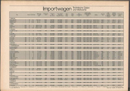 ... 40,9/2600* 9,5:1 2770 1560/1550 4810x1880x1270 E 70 HR 14 1432 9,5 190,0 18-22 HONDA N 600 Touring J F 2 74x69,6 598 38/6000 4,3/5200 8,5:1 1995 1140/1100 3100x1295x1325 5.20-10 560 21,0 130,0 6-8 ISO Leie 300 I K V 8 101,6x88,4 5733 304/4800* 52,5/3200* 10,25:1 2700 1410/1410 4650x1750x1350 205 VR 15 1690 T 7,6 T 233,8 T 22,4 T Grifo Lusso I K V 8 108 X101,6 7443 395/4800* 69,1/3400* 10,25:1 2500 1410/1410 4430x1770x1220 GR 70 VR 15 1510 5,5 290,0 23-27 JAGUAR XJ 6 2,8 GB K 6 83x86 2791 149/5750 25,3/3750* 9,0:1 2765 1473/1482 4814x1543x1343 E 70 VR 15 1630 11,1 190,0 14-18 XJ 6 4,2 GB K 6 92,07x106 4235 186/4500 39,1/3750* 8,0:1 2765 1473/1482 4814x1543x1343 E 70 VR 15 1690 T 10,4T 203,0 T 17,9 T XJ 12 GB K V 12 90x70 5343 269/6000 42,0/3600 9,0:1 2765 1473/1482 4814x1770x1343 205/70 VR 15 n. a. 8,1 225,0 20-26 E V 12 GB K V 12 90x70 5343 269/6000 42,0/3600 9,0:1 2667 1378/1352 4684x1678x1305 E 70 VR 15 1515 6,6 240,0 20-26 JENSEN Interceptor II GB K V 8 107,9x85,95 6276 325/4600 53,0/2800 10,0:1 2670 1440/1450 4720x1750x1350 GR 70 VR 15 1795 T 8,6 T 233,7 T 24,9 T LAMBORGHINI Jarama 400 GT I K V 12 82x62 3929 350/7500 40,0/5500 10,7:1 2380 1490/1490 4485x1820x1190 FR 70 VR 15 1572 T 6,9 T 249,2 T 19,8 T Miura P 400 S I M V 12 82x62 3939 370/7700 39,5/5500 10,7:1 2504 1412/1412 4390x1720x1100 GR 70 VR 15 1305 5,5 280,0 19-23 LANCIA Fulvia Limousine I F V 4 77 x 69,7 ...