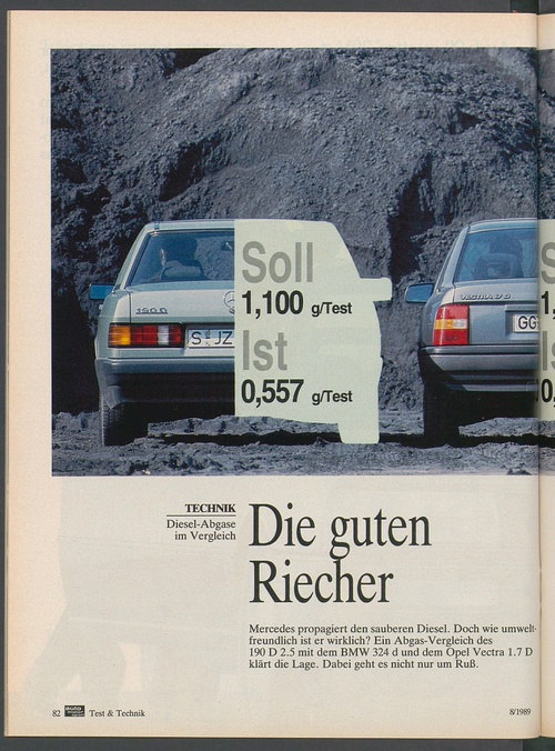 ... IS S* JZ — —i f /Tl' fJk&i sr#’/' /~J7a l»l TECHNIK "T^V Diesel-Abgase I It ß rtlll^Tl im Vergleich | J V (J, Riecher Mercedes propagiert den sauberen Diesel. Doch wie umwelt freundlich ist er wirklich? Ein Abgas-Vergleich des 190 D 2.5 mit dem BMW 324 d und dem Opel Vectra 1.7 D klärt die Lage. Dabei geht es nicht nur um Ruß. Test & Technik 8/1989 ...