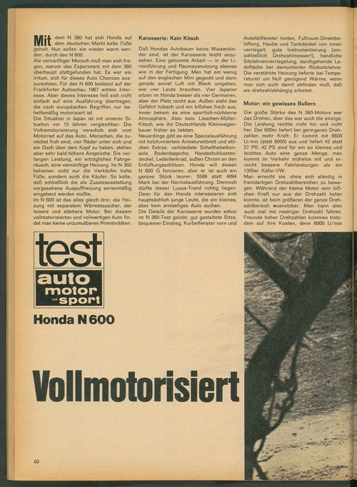 ... als Zusatzausstattung vorgesehene Auspuffheizung serienmäßig eingebaut werden mußte. Im N 600 ist das alles gleich drin: die Hei zung mit separatem Wärmetauscher, der leisere und stärkere Motor. Bei diesem vollmotorisierten und vollwertigen Auto fin det man keine unzumutbaren Primitivitäten. automotor undS|30Pt Honda N 600 Karosserie: Kein Kitsch Daß Hondas Autobauer keine Waisenkin der sind, ist der Karosserie leicht anzu sehen. Eine gekonnte Arbeit — in der Li nienführung und Raumausnutzung ebenso wie in der Fertigung. Man hat ein wenig auf den englischen Mini geguckt und dann gerade soviel Luft mit Blech umgeben, wie vier Leute brauchen. Vier Japaner sitzen im Honda besser als vier Germanen, aber der Platz reicht aus. Außen sieht das Gefährt hübsch und ein bißchen frech aus, innen bekam es eine sportlichnüchterne Atmosphäre. Also kein Lieschen-Müller- Kitsch, wie ihn Deutschlands Kleinwagen bauer früher so liebten. Neuerdings gibt es eine Spezialausführung mit holzfurniertem Armaturenbrett und etli chen Extras: verkleidete Schalthebelkon sole, Bodenteppiche, Handschuhkasten deckel, Lederlenkrad, außen Chrom an den Entlüftungsschlitzen. Honda will diesen N 600 G forcieren, aber er ist auch ein ganzes Stück teurer: 5599 statt 4894 Mark bei der Normalausführung. Dennoch dürfte dieser Luxus-Trend richtig liegen. Denn für den Honda ...